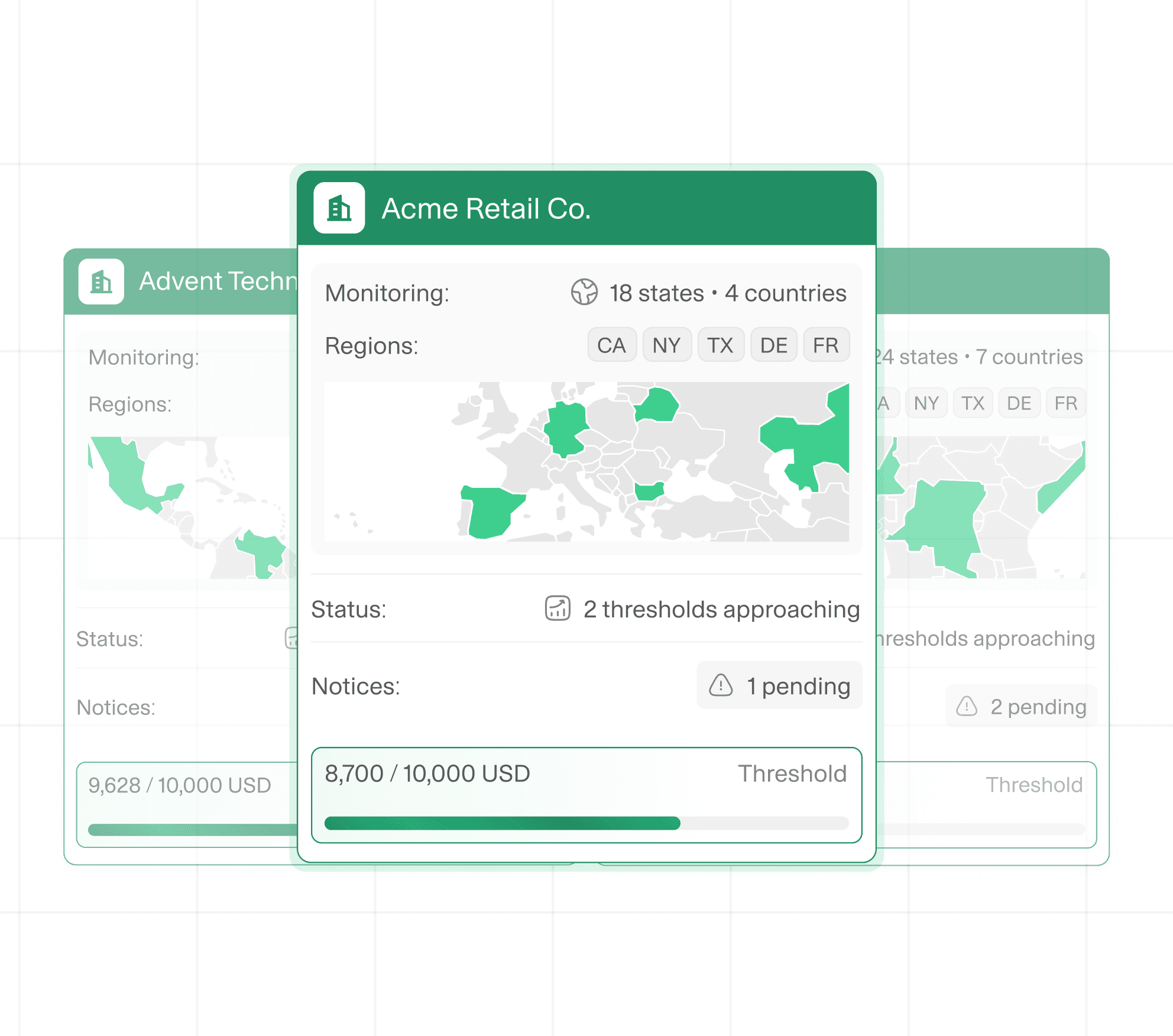 Track transaction volume and physical presence by state, and receive alerts when nearing a threshold.