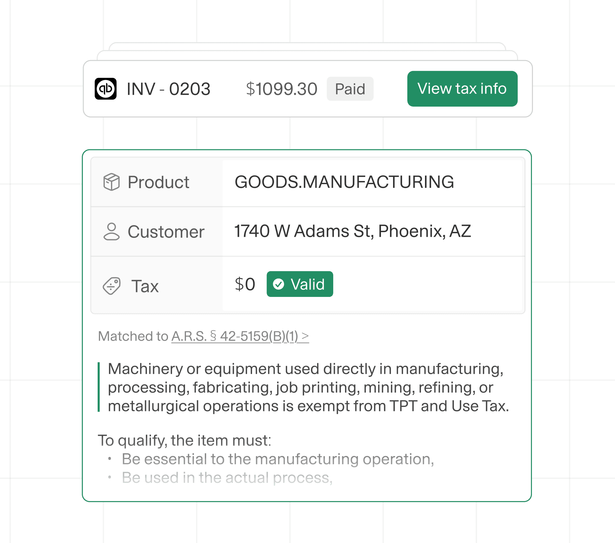 Point of use exemptions, multiple seller locations, partial exemptions, excise taxes, consumer use tax, and more. Built to scale so you’ll never outgrow your tax engine.